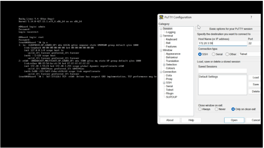 For this lab, I had to configure a dedicated VM to remote into via using putty software. In this example, I used a Rocky Linux machine and set it up as “minimal install”, giving me only a command line interface (CLI). Above shown in the CLI are the different network interface cards (NICs) in Rocky. The first one contains the Wide Area Network NIC and the Second one contains the Local Area Network NIC.