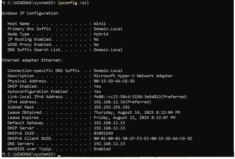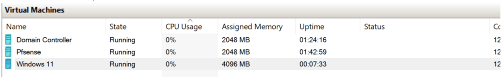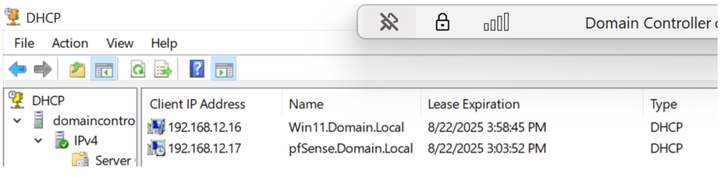The two pictures above show how both the Windows 11 and Pfsense VMs are within the same scope of the Domain Controller’s DHCP. Ideally in the real world you wouldn’t want these networking devices to communicate this way. But, for lab purposes it must be configured in that order. The Pfsense is theoretically supposed to act as external firewall for the internal network for the Domain Controller and Windows 11 machine. Now that all VMs are communicating, we still must properly configure each device to ensure device hardening and so that they perform their proper functions.
