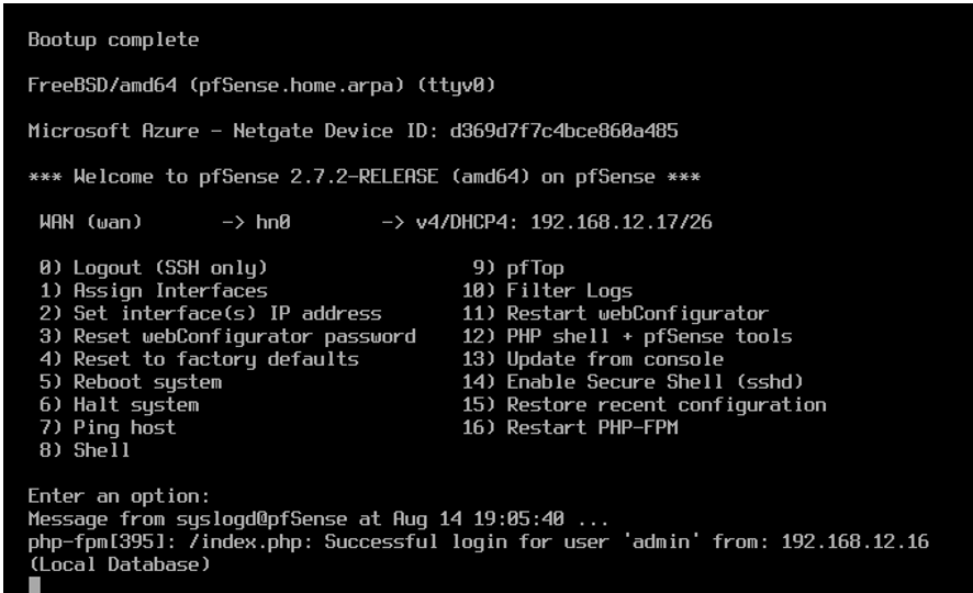 For Pfsense, after we have initially installed it, we have to reconfigure its network interface. Since it’s booted up within a private network, it only contains the network interface “hn0” as the wide are network. So, “hn0” will need an IP address so that Pfsense can communicate with the internet. In our case, it’s automatically assigned an IP address from the scope of the Domain Controller since it was recognized on the same network.